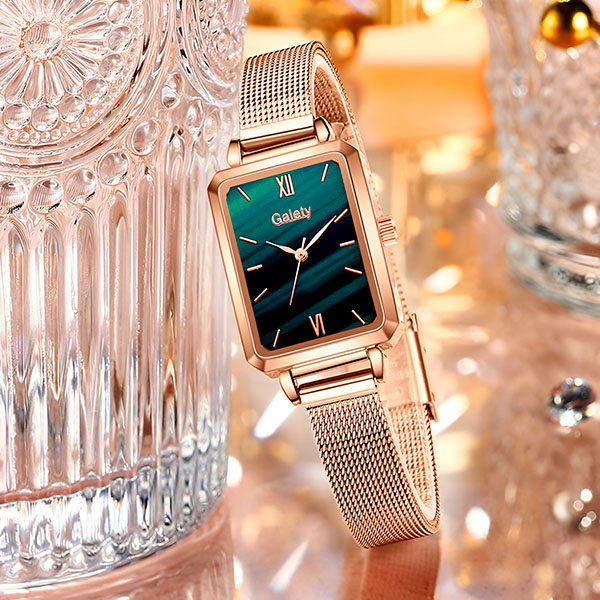 Овој часовник има сјајна розово-златна боја и прекрасен зелен циферблат. Додава стил на секоја облека, фармерки или формална облека.