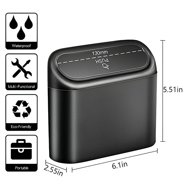 Опремен со сигурен капак, спречува мириси и задржува отпадоците внатре. Неговиот дизајн отпорен на пролевање гарантира дека нема нечистотии или пролевања, одржувајќи хигиенична средина во автомобилот.