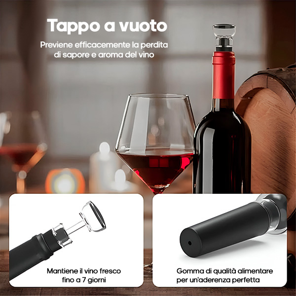 Само поставете, притиснете и налевајте! Отварачот го отстранува чепот за неколку секунди, додека аераторот обезбедува рамномерно и без пролевање наливање. Запечатете со вакуумскиот чеп за подолго одржување на свежината на виното – без напор и без неред!