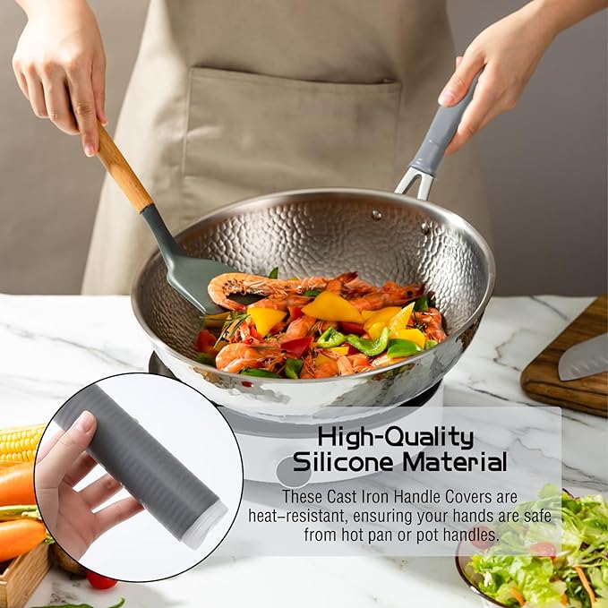 Нашиот силиконски капаци се дизајнирани да бидат компатибилни со широк спектар на дршки на тенџери и тави, правејќи ги во универзални и прилагодливи кујнски додатоци, совршени за тави од леано железо и рамнодневни тави.