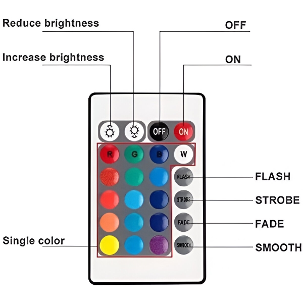AQUASHEIN е опремен со удобен далечински управувач што овозможува лесно регулирање на осветлувањето. Со 24 копчиња, може да изберете помеѓу 16 RGB бои и четири динамични мода (блиц, стробоскоп, затемнување, глатко). Може да ги контролирате светлата од максимална далечина од 10 метри, обезбедувајќи безпроблемна персонализација.