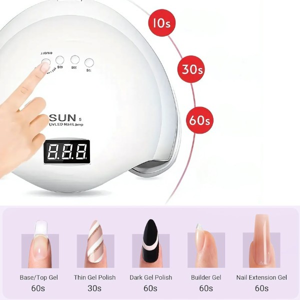 Со 3 тајмер поставки (10с, 30с, 60си), можете да го прилагодите процесот на сушење според вашиот тип на гел и лични потреби. Паметниот сензор автоматски се вклучува кога вашите раце или нозе се поставени под лампата, осигурувајќи безгрижно искуство секој пат.