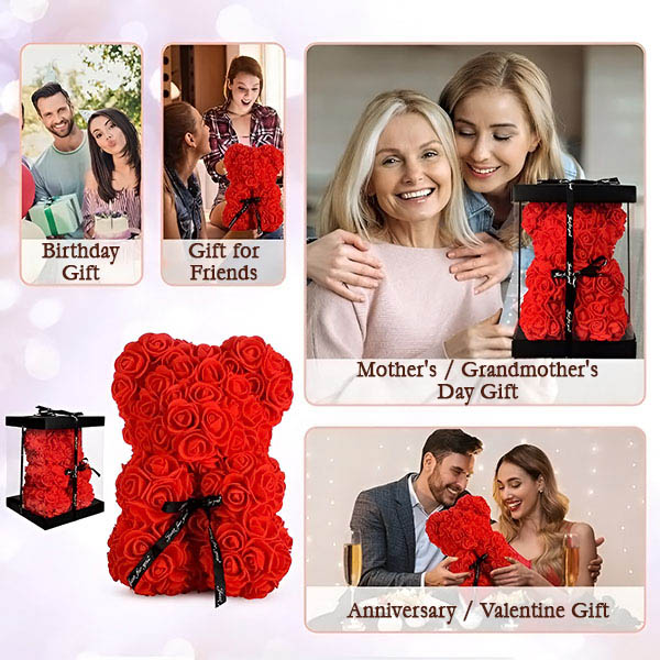 Направен од рози кои никогаш не увенуваат, овој мечок додава трајна убавина во секоја просторија. Совршен за вашата мајка, партнер или пријателка, комбинира удобност со вечниот шарм на розите, што го прави подарок кој тие никогаш нема да го заборават.