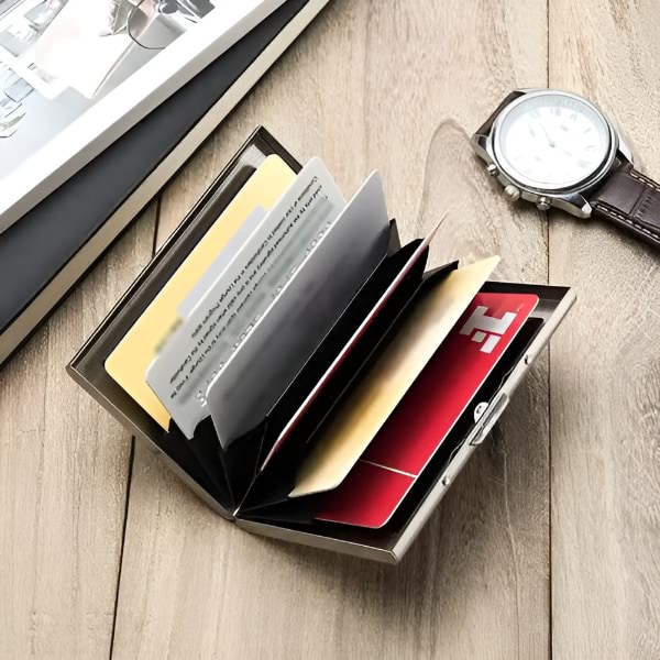Направен од висококвалитетен не’рѓосувачки челик, овој паричник е поиздржлив и со подолг рок на траење од пластичните или алуминиумските опции, нудејќи супериорна заштита за вашите картички.
