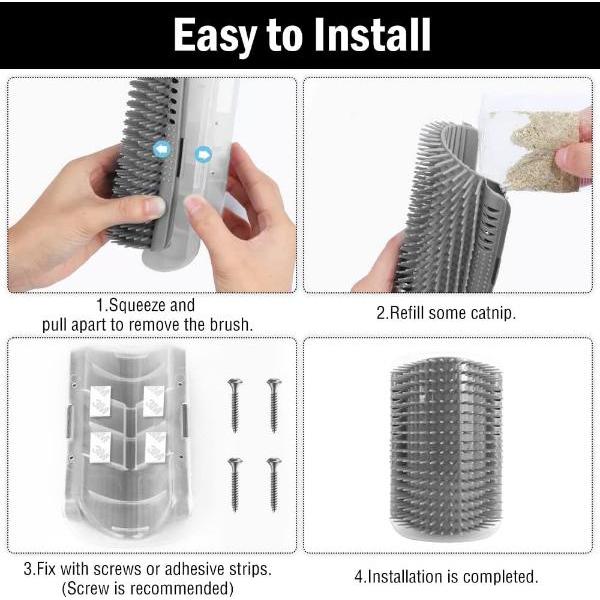Мачките можеби ќе треба време да се навикнат на овие аголни четки за мачки; може да го зголемите нивниот интерес додавајќи малку мачја трева (не е вклучена).
